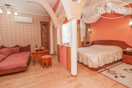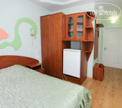 3. Номер. У нас был полулюкс 3-х местный на двоих (номера поменьше не оказалось на момент брони). Номер большой, просторный № 12 на втором этаже. Окна выходили во двор, без вида, но было достаточно тихо, что я очень ценю. На окне, почему-то, решетка. Номер был чистым, без запаха табака, балкон отсутствовал, видимо потому, что мы не курящие и нам балкон не нужен? Постельные принадлежности в хорошем состоянии, никаких пятен, все белоснежное. В номере был двухместный диван, двухместная кровать + 2 тумбочки, телевизор с плоским экраном, туалетный столик с зеркалом, угловой шкаф с достаточным количеством вешалок, журнальный столик. стул ( 1 шт.), холодильник, чайник, фен, несколько тарелок и приборы, 3 стакана и 3 чашки. На полу был коврик. Большая и просторная ванная комната с душ кабиной (без розеток для фена и всего электрического), дозатор с жидким мылом на раковине + еще один в душ кабине. Все работало, полотенца меняли часто, они были белоснежными (спасибо за прекрасное белье и полотенца отелю). Ключ был 1 на двоих и при уходе из гостиницы мы его должны были сдавать на ресепшен (это не очень удобно, но такие правила).