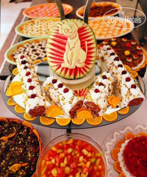 По питанию все приемлемо. Вкусно. Пусть и без изысков. На все приемы пищи был арбуз и дыня. Вечером мандарины виноград и яблоки. Мясо, рыба, курица. Посуда чистая и без сколов. Всегда радовал лично меня имеющийся в баре айран. Отвел душу. Персонал шустрый и опрятный. Да очереди в начале, но через 40 минут все свободно. Отель, кстати ,заполнен весь в октябре. Оооочень много граждан Польши. Похоже там он в топе.