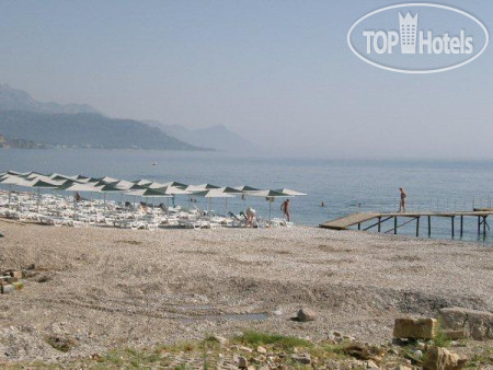 До пляжа идти минуты 3, пляж не очень большой, но лежаков хватает, рядом с пляжем сдают всякие водные развлечения, на пляже бар, но там можно бесплатно взять только простую воду, чай, напитки, вроде, фанты, колы и тд, но как будто бы они разбавленные. Пляж галька, мы брали с собой аквасоки, в Турции они стоят дороже.